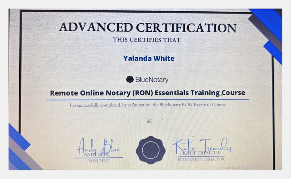 She holds Advanced Certification as a Remote Online Notary (RON) , having successfully completed the BlueNotary RON Essentials Training Course by examination.
